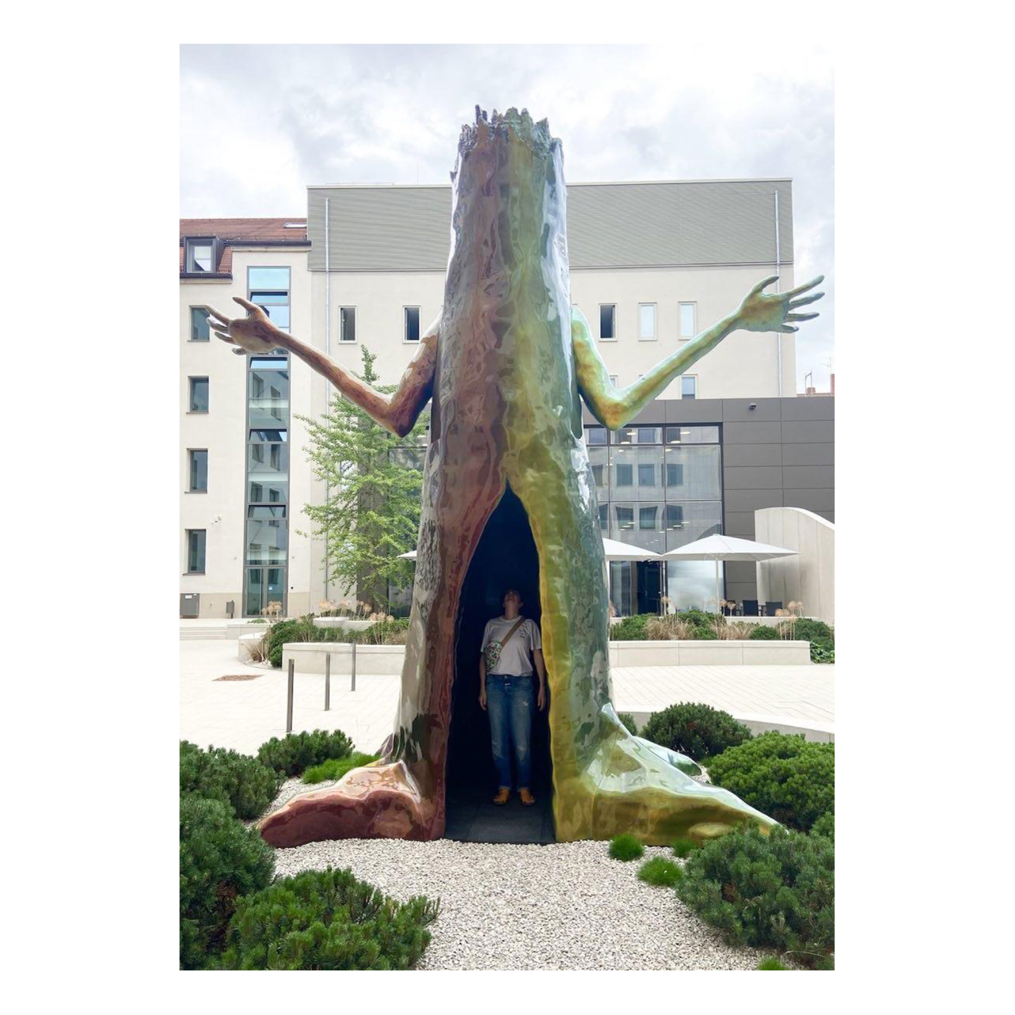| Ein Thermodrucker der GeBE Elektronik und Feinwerktechnik GmbH aus Germering, der GeBE-COMPACT Plus, kommt jetzt in einer besonderen Anwendung im öffentlichen Raum zum Einsatz. Im Innenhof des Bayerischen Landesamts für Statistik in Fürth lädt seit seiner Einweihung am 13. Juli 2021 das Kunstwerk „KALA HET DIWAI oder der Baum der Wissbegier“ des Künstlerduos Böhler & Orendt aus Berlin Besucher mit Fragen zum Nachdenken ein. Wenn Interessierte das Innere des Baumes betreten und den Satz „Frag mich, KALA“ aussprechen, wird ein elektronischer Prozess in Gang gesetzt, und es fallen Zettel mit Fragen aus dem im oberen Bereich des Baumes unsichtbar montierten GeBE Drucker herab. So werden die Besucher der fünfeinhalb Meter hohen Skulptur in das erzeugte Spannungsfeld von institutionellem Standort und interaktivem Kunstwerk einbezogen. Mit der Arbeit möchten Böhler & Orendt die Mitarbeiter des Statistischen Landesamts und Gäste des Hauses dazu einladen, „out of the Box“ zu denken und sich mit ungewöhnlichen Fragen auseinanderzusetzen, die sie sich sonst vielleicht nie gestellt hätten. Bereits Ende 2019 hatten die beiden Künstler den gewünschten Drucker für Ihr Projekt angefragt und sich auch schnell für den outdoorgeeigneten GeBE Thermodrucker mit Abschneider entschieden. Coronabedingt fand die Vernissage erst jetzt statt. | |